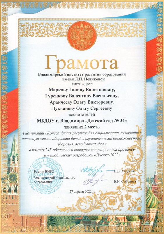 Сегодня во Владимирском институте развития образования имени Л.И. Новиковой, кафедрой дошкольного образования проведен форум «Детствосберегающий потенциал дошкольного образования Владимирской области», на котором состоялось торжественное награждение победителей регионального конкурса инновационных проектов и методических разработок «Пчелка-2022».